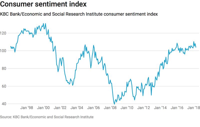 The latest KBC Bank/Economic and Social Research Institute consumer sentiment index fell to 104 in April down from 108 in March and a record 110.4 in January.
