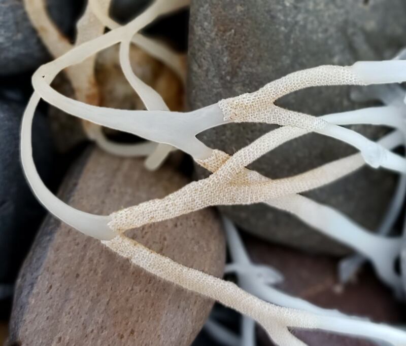 I photographed this piece of washed-up seaweed on Bray beach but only later noticed its branches seem to be covered in a “sleeve” of what looks like woven fabric. Is this natural or would it have attached itself? Susan Blake, Co Wicklow