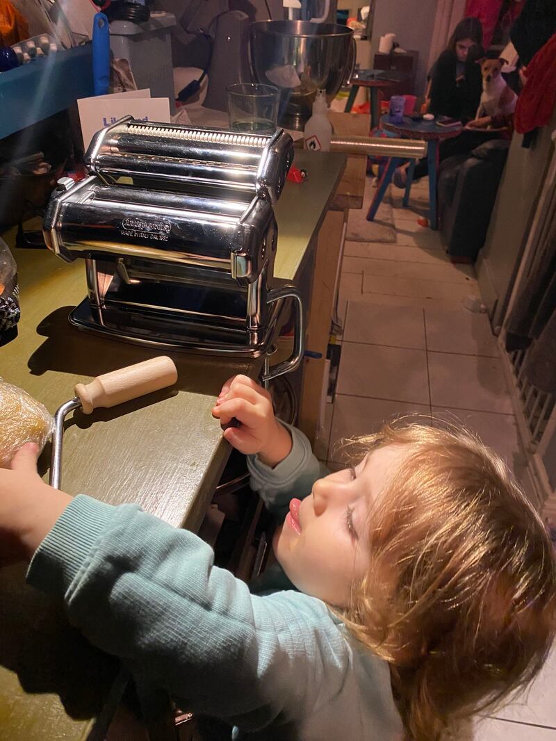 While my stock bubbles like a witch’s broth, I turn my attention to making the ravioli happen. I take the pasta maker I was given as a present a couple of years ago out of its box and hand it to my wife, who is much better at assembling such things than I am. Soon it is clamped to a surface and I start rolling out the pasta into thin sheets, with my empathetic child who, it turns out, is much, much better at it than I am.