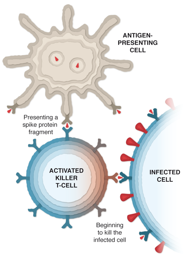 The antigen-presenting cells can also activate another type of immune cell called a killer T-cell to seek out and destroy any coronavirus-infected cells that display the spike protein fragments on their surfaces.