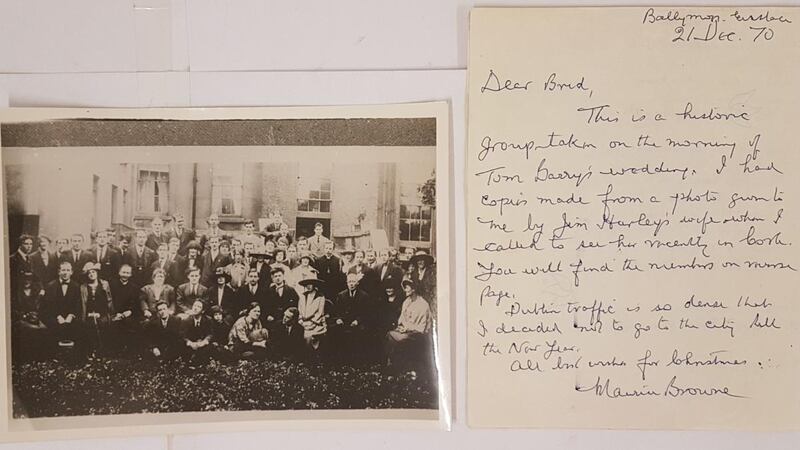 Lot 405 is an original photograph of Irish republican Tom Barry's wedding party that includes de Valera and Countess Markievicz (€300-€600), while Lot 399 is an original photograph of an almost smiling Peig Sayers, with a large group of local people on the Blasket Islands (€50-€100).