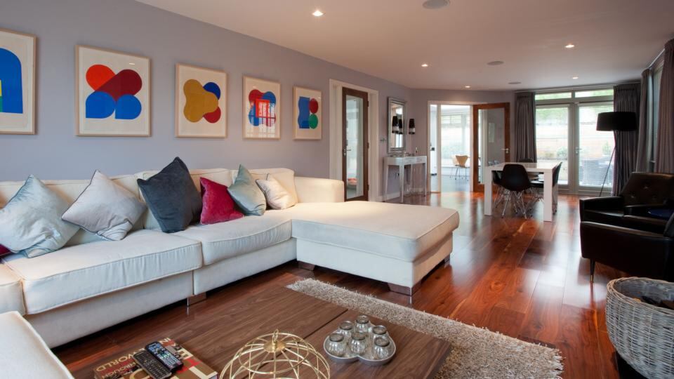 The open-plan living and dining room, featuring polished walnut flooring, was two rooms in the original plans, but now stretches the entire length of the house. In keeping with the sleek design, all the ugly television boxes and wiring are kept in the control cupboard under the stairs, allowing sound and vision to be controlled by red-eye units. A five-camera security system is also housed here.