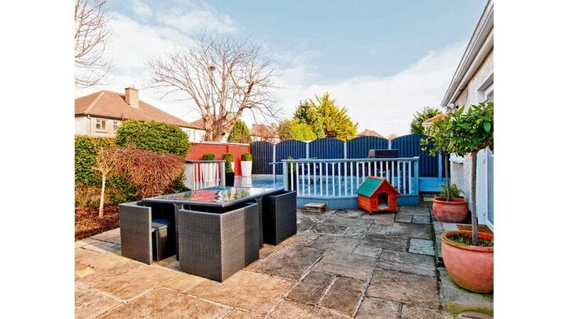 The front gardens in these houses are open-plan and the estate looks to be well-managed – the annual management fee for this house is €275. At No 69, the large garden wraps around the side and back. It has a big timber deck, a flagged patio area and large lawned area bordered by maturing trees, as well as off-street parking for two cars in the front driveway.