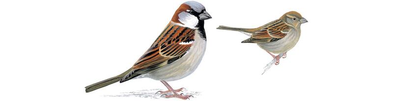 A familiar streaky-brown garden visitor, the male has a large black bib, dark brown head with a grey crown, pale grey underparts and a small white bar on each wing. The female is a duller beige overall, with a streaky-brown back and a paler beige stripe just above the eye. Typical size: 15cm. ► Tap to listen to a house sparrow