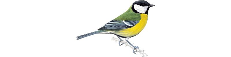 The largest member of the tit family. It has a black head with white cheeks. The underparts are bright yellow with a wide black stripe, which is wider in males than in females. Typical size: 14cm. ► Tap to listen to a great tit