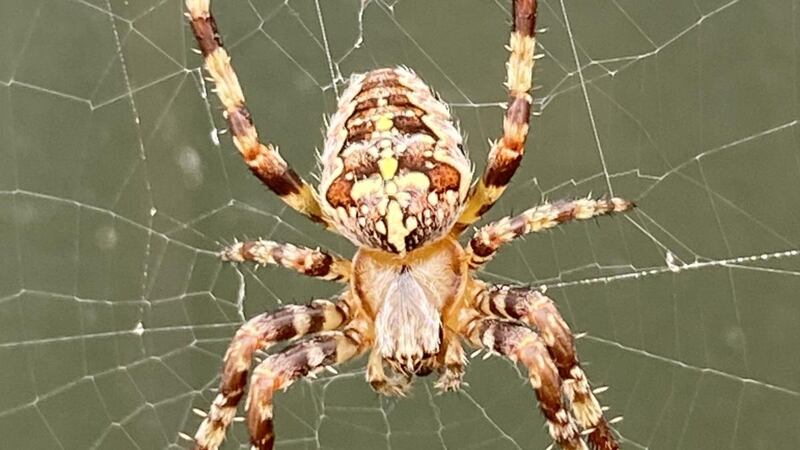 This colourfully-patterned spider made its web on a walkers' shelter-hut, on Seecon hill in Connemara. – Ray Butler It is the Garden spider.