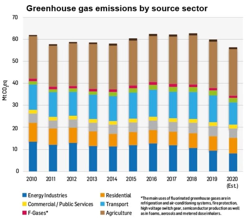 Greenhouse gas emissions declined in 2020 by 5.9 per cent mainly due to Covid-19; the biggest annual fall since the aftermath of the 2008 financial crash, according to analysis by the EPA and Sustainable Energy Authority of Ireland (SEAI).