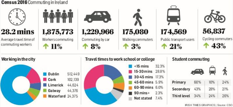 Census 2016 figures from the Central Statistics Office reveal a larger number of people travelling to work, school or college, leaving earlier in the morning and spending longer periods on the road.