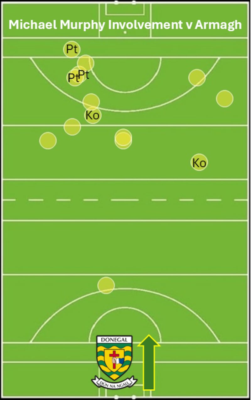 He added another point off his right from play and another from a free. He linked passes on the outside of the Armagh defensive system, with an 100 per cent completion rate. Then he won a mark from a Patton kickout and set up Odhran Doherty for a point. The only blot of any description was one wide from play, and as the hooter blared in Ballybofey, it was Murphy in possession of the ball. Folk hero impact doesn’t have a measurement.